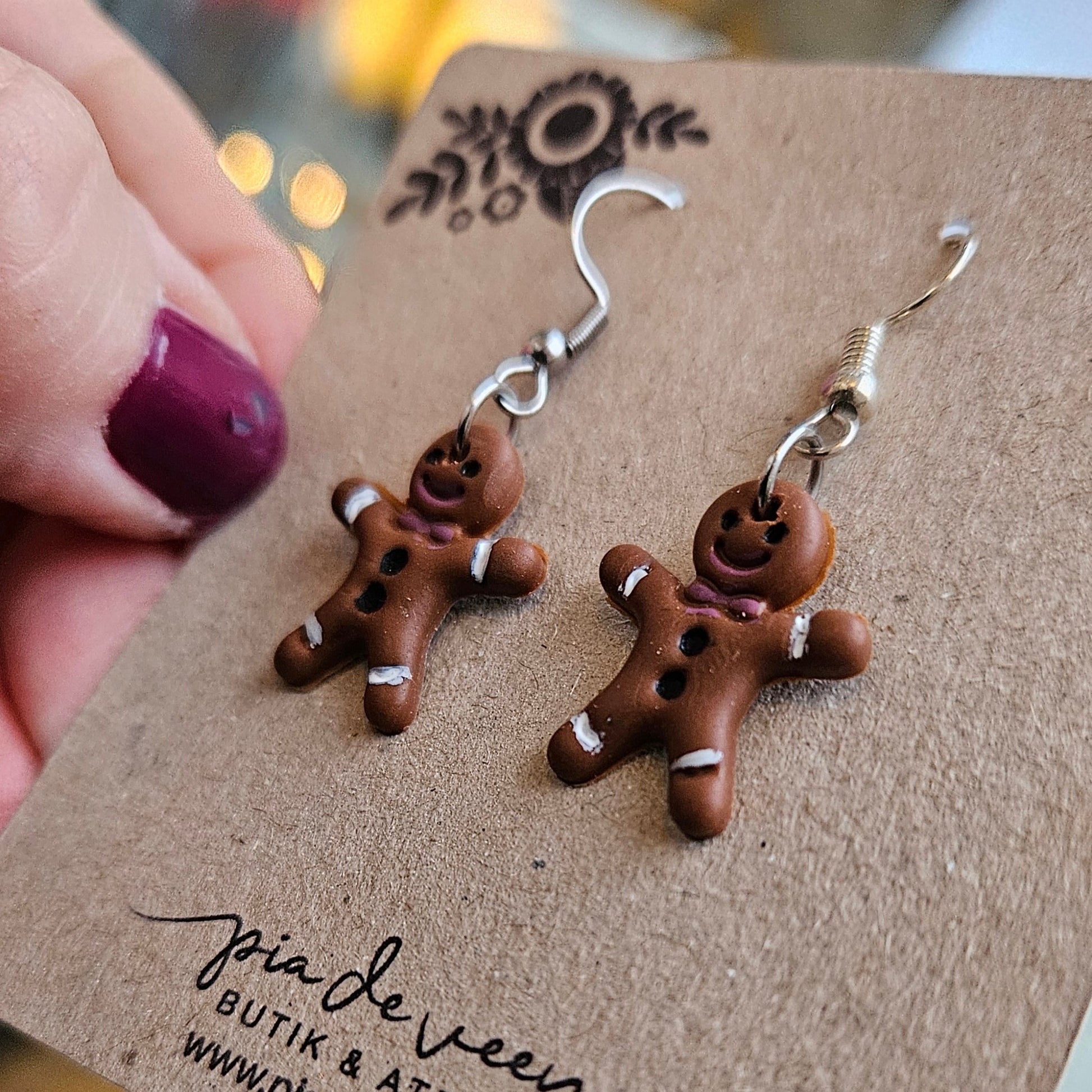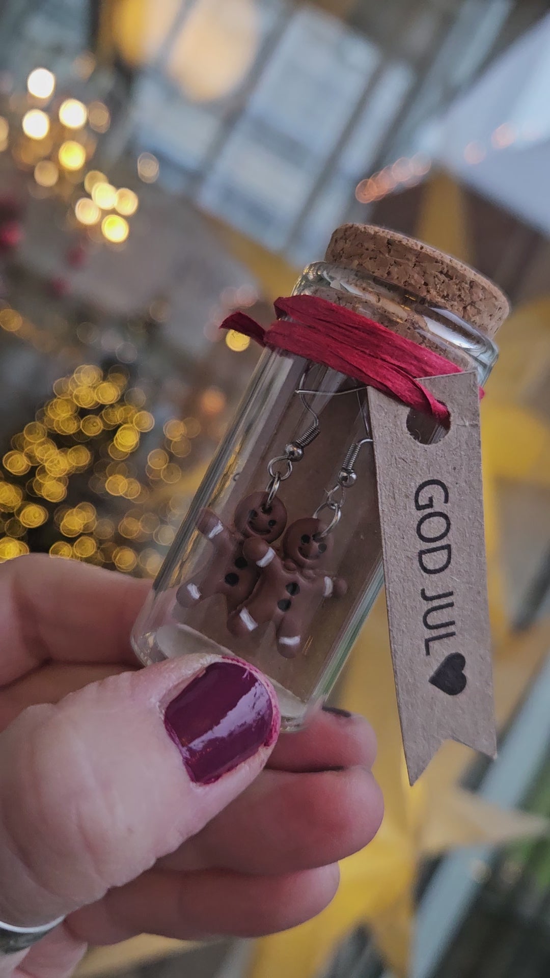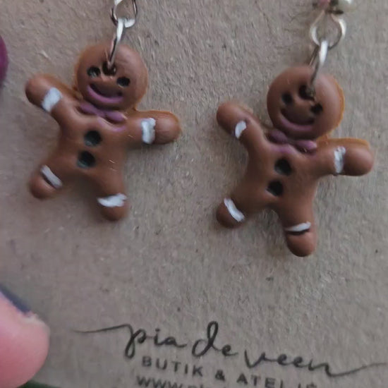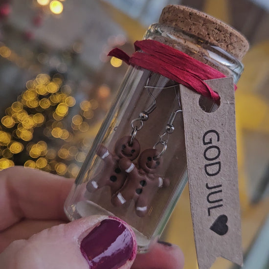 Nybakade, söta örhängen i form av små pepparkaksgubbar! Välj mellan örhängen på smyckeskort eller i en gullig, liten glasburk med kork, färdigt att ge bort som julklapp med rött snöre och en etikett med julhälsning. Varje par är handgjorda med massor av kärlek och är därför unika.