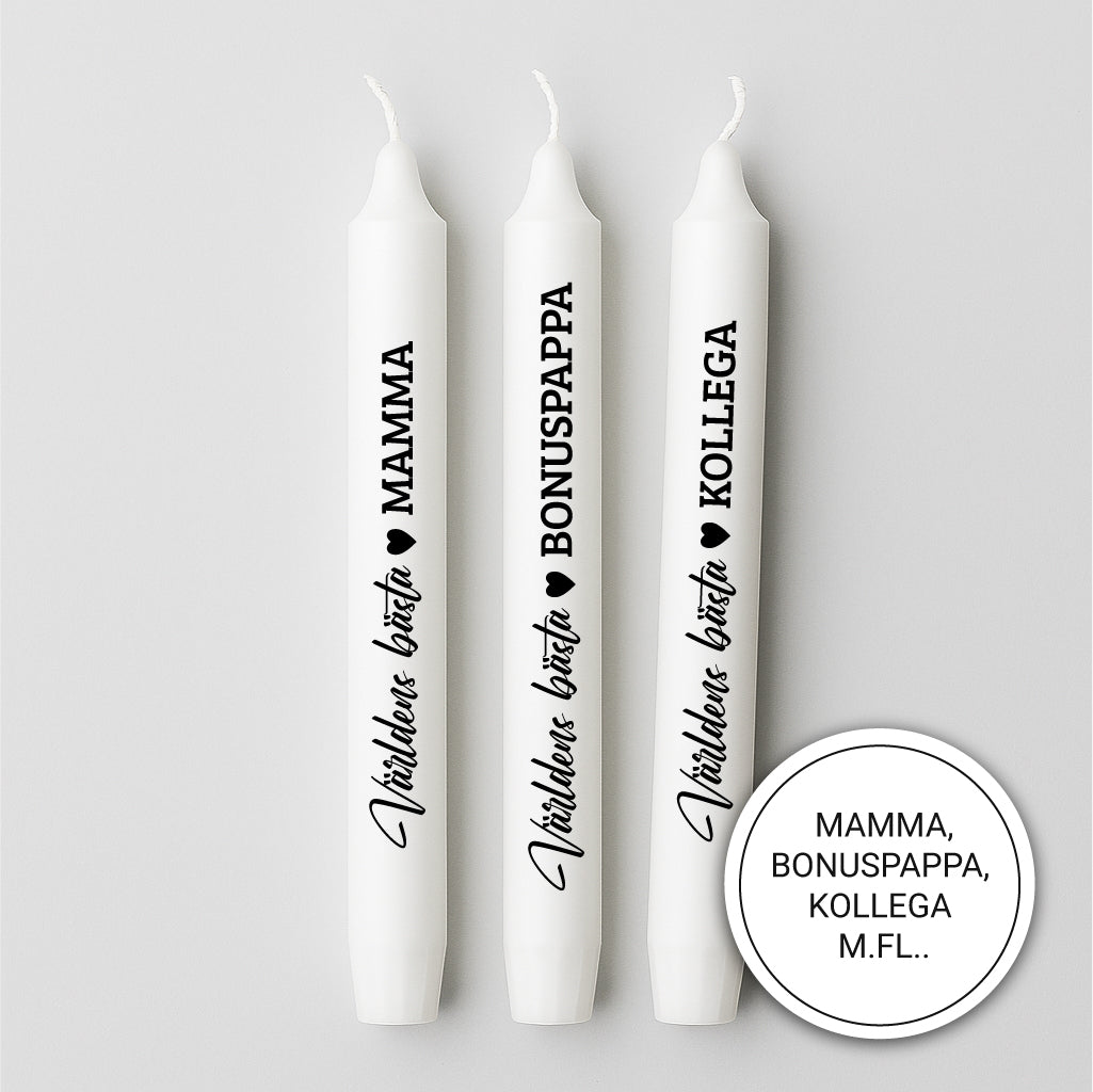 Ibland räcker ett enkelt ljus för att säga det där vi tänker men glömmer att säga. De här personliga ljusen med kärleksfulla texter finns till allt från mamma som till kollegan, pappa, vännen eller bonusmormor...